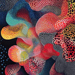 Abstract composition of vibrant, interconnected cellular forms. Technique: Acrylic on canvas, influenced by Yayoi Kusama and Damien Hirst Artist's Intent: To evoke a sense of wonder and fascination with the intricate patterns and vibrant colors of microscopic life. Contribution: High decorative appeal, suitable for contemporary and eclectic interiors. Strong potential for art prints and merchandise. Influences: Meticulous pointillist technique creating intricate cellular patterns and biomorphic forms.