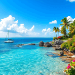 Discover an enchanting tropical escape with crystal-clear turquoise waters, lush palm trees, and vibrant exotic flowers. A sleek white sailing yacht drifts peacefully near the rocky shoreline, adding to the serene and luxurious ambiance. This breathtaking coastal paradise is the ultimate destination for relaxation, adventure, and unforgettable summer getaways.