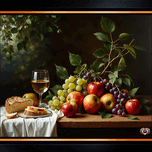 Still Life of Wine, Grapes, and Apples in a Tranquil Garden Setting AI Concept Art by Xzendor7; invites the viewer into a serene and timeless moment, ...[+]