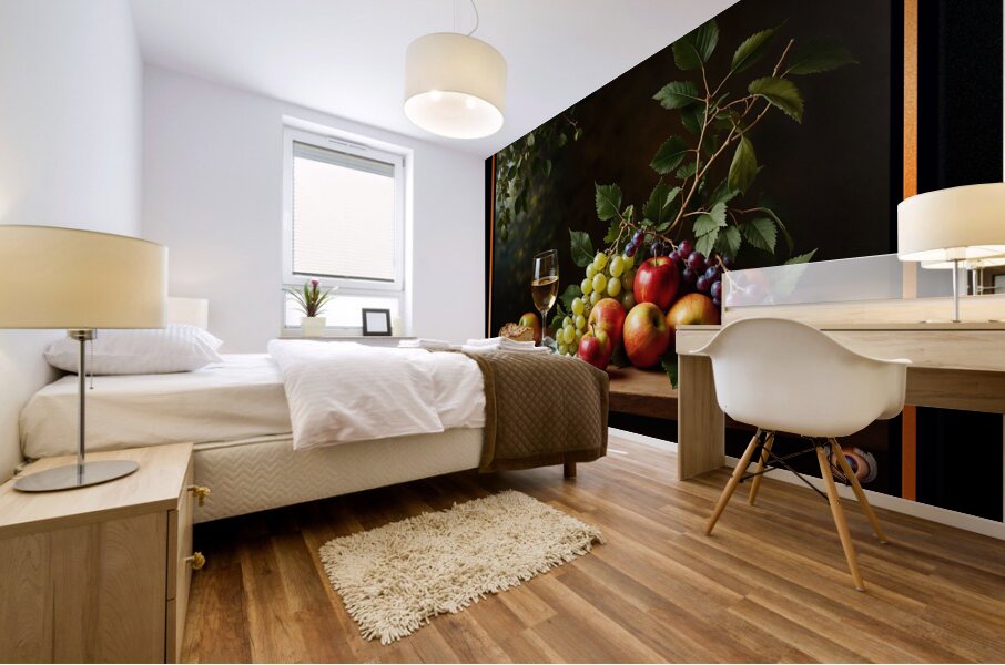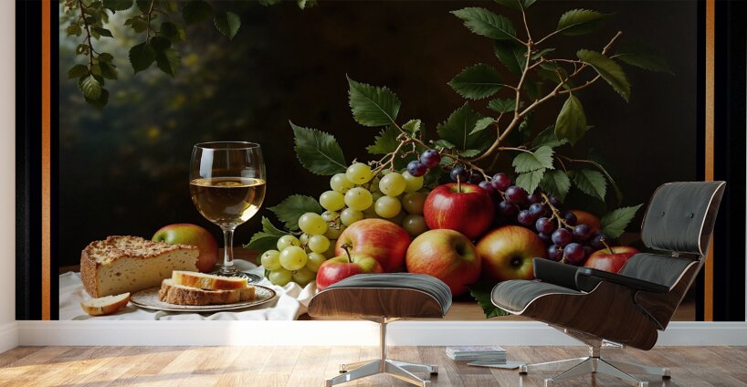ABOUT THIS ARTWORK: STILL LIFE OF WINE GRAPES AND APPLES IN A TRANQUIL GARDEN SETTING ALLURING AI CONCEPT ART BY XZENDOR7