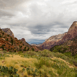 I created this landscape photo of dramatic clouds over the sandstone rock formations while hiking around Zion National Park in Utah. There is a lot of prickly pear cactus in the foreground.