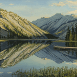 English: This captivating painting showcases a serene mountain lake, its calm waters perfectly reflecting the surrounding majestic mountains and lush ...[+]
