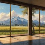 English: This stunning digital artwork showcases a modern interior space with breathtaking panoramic views of a majestic mountain range. The room is bathed in natural sunlight, highlighting the clean lines and minimalist design. Large glass windows seamlessly connect the interior with the exterior, creating a sense of openness and tranquility. Modern furniture, including a comfortable chair and a small table with decorative items, adds a touch of elegance to the space. The vibrant green of the meadow leading up to the mountains creates a striking contrast against the snow-capped peaks and the clear blue sky. The artist's masterful use of light, color, and perspective invites the viewer to imagine themselves in this serene and inspiring space.