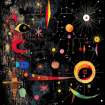 A whimsical dreamscape filled with celestial bodies, biomorphic forms, and symbolic elements. Technique: Mixed media on canvas, influenced by Joan Miró and Paul Klee. Artist's Intent: To evoke a sense of wonder and curiosity, inviting viewers into a dreamlike world filled with symbolic imagery and playful forms. Contribution: Appeals to collectors of modern and contemporary art, particularly those interested in Surrealism, abstract art, and works with a whimsical, dreamlike quality. Influences: Dynamic composition with playful, biomorphic forms, vibrant colors, and a textured, layered background. Combines abstract shapes with symbolic elements.