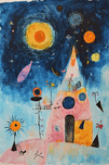 Whimsical pink house under a vibrant celestial sky, populated by playful symbols and organic forms. Technique: Lithograph, influenced by Paul Klee an...[+]
