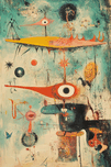 Whimsical biomorphic forms float in a celestial dreamscape. Symbolic eyes and figures add narrative intrigue. Technique: Oil on canvas, influenced by Joan Miró and Paul Klee. Artist's Intent: To evoke a sense of playful wonder and explore the subconscious through a vibrant, dreamlike narrative. Contribution: Appeals to collectors of mid-century modern and surrealist art. Strong potential for licensing in home decor and fashion. Influences: Biomorphic abstraction with playful, dreamlike forms and balanced asymmetry. Use of bold, flat colors and textured layering.