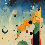 Whimsical abstract composition with biomorphic shapes and geometric forms against a celestial backdrop. Technique: Acrylic on canvas, influenced by Wassily Kandinsky and Paul Klee. Artist's Intent: To evoke a sense of playful wonder and cosmic harmony through abstract forms and vibrant colors. Contribution: Appeals to collectors of mid-century modern and abstract art, with potential for placement in contemporary and eclectic décor. Influences: Biomorphic abstraction with playful geometric elements and layered washes, creating a sense of depth and movement.