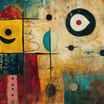 Abstract composition with geometric shapes and symbolic forms on a textured background. Technique: Oil on canvas, influenced by Paul Klee and Wassily...[+]