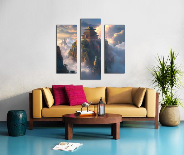 Temple on a mountain peak above clouds. Technique: Digital painting, influenced by Caspar David Friedrich and Zhang Zeduan Artist's Intent: To evoke a sense of serenity and wonder in a fantastical setting. Contribution: High market appeal for fantasy art collectors and fans of Asian aesthetics. Influences: Detailed rendering of textures, atmospheric perspective, and light effects.