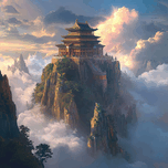 Temple on a mountain peak above clouds. Technique: Digital painting, influenced by Caspar David Friedrich and Zhang Zeduan Artist's Intent: To e...[+]