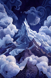 A majestic mountain peak pierces a swirling, cloud-filled sky under a watchful moon. Technique: Digital painting, influenced by Katsushika Hokusai and Albert Bierstadt. Artist's Intent: To evoke a sense of awe and wonder at the power and beauty of nature, and the mystical allure of the mountains. Contribution: Appeals to those interested in fantasy, nature, and East Asian aesthetics. Strong potential for prints, merchandise, and book covers. Influences: Detailed linework creates swirling patterns within clouds and mountain forms, giving a sense of movement and energy.