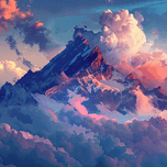 A majestic mountain peak pierces a vibrant, cloud-filled sky, bathed in the warm glow of sunset. Technique: Digital painting, influenced by Albert Bi...[+]