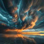 Dramatic sunset reflected on still water beneath a tempestuous sky. Technique: Digital photograph, influenced by Ansel Adams and Thomas Moran. Artist's Intent: To evoke a sense of awe and wonder at the power and beauty of nature. Contribution: High market appeal due to its dramatic and visually stunning nature. Suitable for large-scale prints and home decor. Influences: Long exposure photography capturing dramatic cloud formations and reflections during sunset.