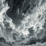 Dramatic monochrome cloudscape evoking a sense of celestial turbulence and ethereal beauty. Technique: Digital photograph, influenced by Ansel Adams and Minor White. Artist's Intent: To capture the raw power and delicate beauty of nature's forces, evoking a sense of awe and wonder. Contribution: Strong appeal to collectors of atmospheric and abstract photography, with potential for use in fine art prints, home décor, and editorial contexts. Influences: Black and white photography emphasizing dynamic cloud formations, tonal contrast, and atmospheric depth.