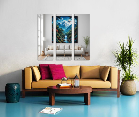 This stunning wall art captures a vibrant psychedelic landscape, showcasing a serene river flowing through a lush forest and majestic mountains. A captivating waterfall cascades down amidst rich foliage, creating a surreal atmosphere. The intricate details and bright colors evoke a dreamlike quality, making it a perfect addition to any space. Ideal for nature lovers, this artwork adds an enchanting touch to home decor, inviting viewers to immerse themselves in its beauty and tranquility. Perfect as a unique gift or a statement piece for your living area.