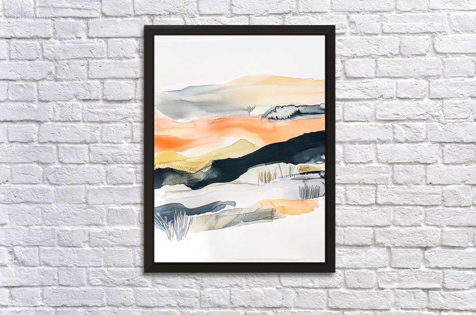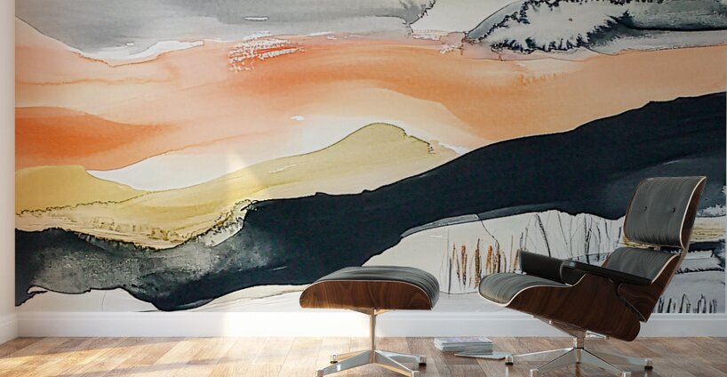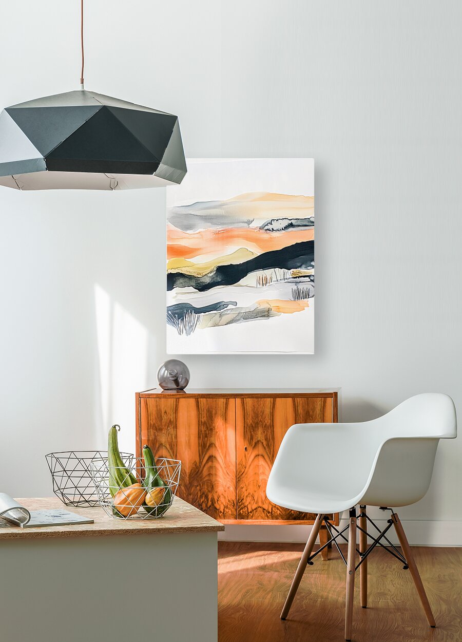 A harmonious blend of warm oranges cool grays and muted greens suggests a serene landscape with abstract forms. Soft flowing layers evoke a sense of c...[+]