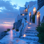 This vintage modern oil painting of Santorini glows with rich shades of blue, capturing the island’s beauty with a timeless yet contemporary flair. Crimson skies cast a warm light over the vivid color washed buildings, while soft coral hues reflect on the Aegean Sea. The blend of vintage charm and modern style brings Santorini’s vibrancy to life in a stunning, romantic masterpiece.