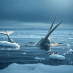 Narwhal’s Unicorn Moment" Visual: A narwhal surfacing in icy waters, its spiral tusk glinting in sunlight. Beauty: Mythical appearance in a stark Ar...[+]