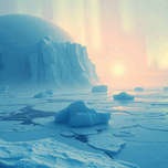 An Ice Planet with Frozen Oceans and Floating Icebergs This icy world is covered in a thick layer of blue ice, with frozen lakes stretching as far as the eye can see. Giant icebergs drift through the cold atmosphere, and faint auroras glow above, creating a peaceful and mystical scene