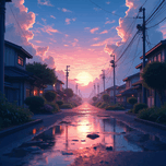 Highest resolution 8K resolution. A very fantastic anime-style scenery with puddles reflecting light against the background of an alley in a residential area at dusk. A fantastic rainbow landscape filled with countless clouds and lights, and the bright clouds in the foreground add contrast and dynamism to the composition. Extremely ultra-high resolution, vibrant colors, and adjustable cloud depth and sky brightness.