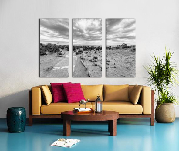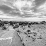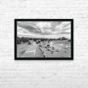 Clouds fill the sky over a beautiful black and white desert landscape along the hiking trail to Mesa Arch in Canyonlands National Park. Located in Moab, Utah, United States, this path leads through desert dirt and sand with spots of vegetation along the way. There are also cool twisted dead junipers trees and drift wood. In the distance a hazy peak of the Buck Canyon that awaits to give your eyes to feast on. This photo was taken by Jennifer White with Timeless Moments Photography. All images are copyrighted © Timeless Moments Photography/Jennifer White. All rights reserved. Please note the watermark does not print on ordered products.