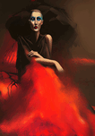 "Immerse yourself in this dramatic artwork, dominated by a striking figure cloaked in a fiery red dress. The contrasting black backdrop enhances the elegant and bold presence of the subject. Rendered in a painterly style, this artistic illustration exudes an intense and moody atmosphere, showcasing both fashion and visual storytelling in a truly striking manner. "