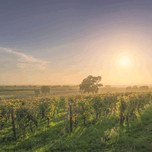 BOLGHERI VINEYARDS AND TREES IN A FOGGY SUNSET