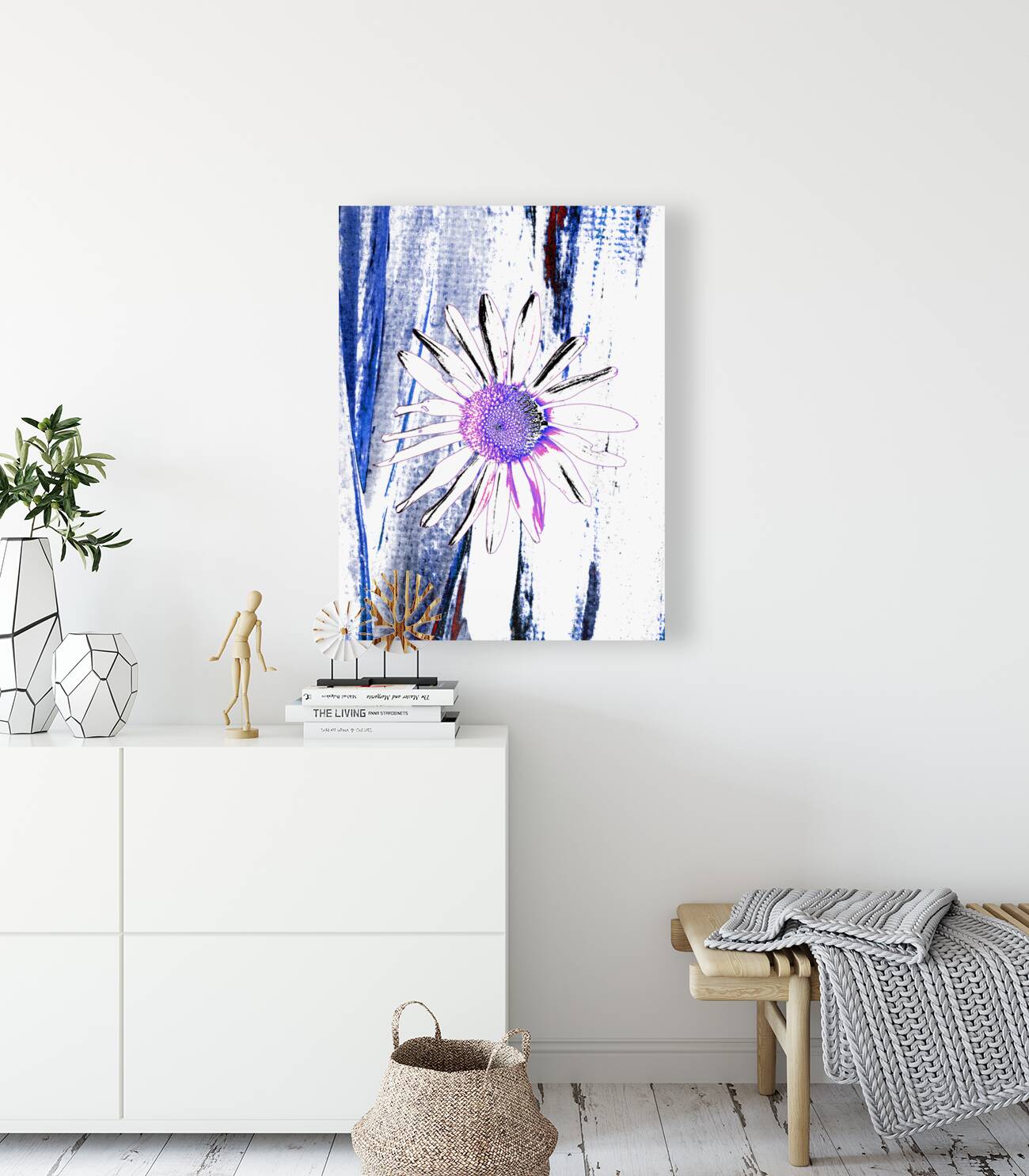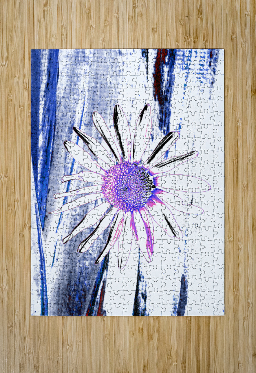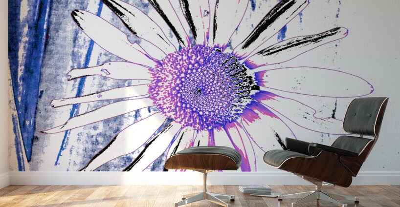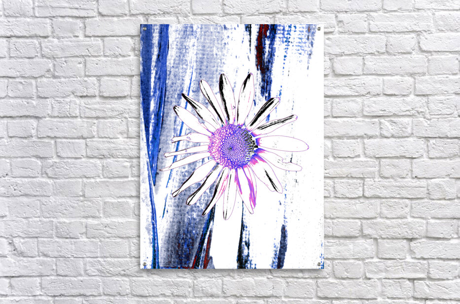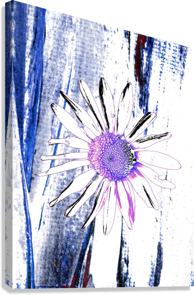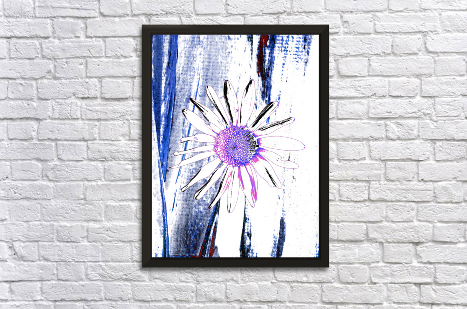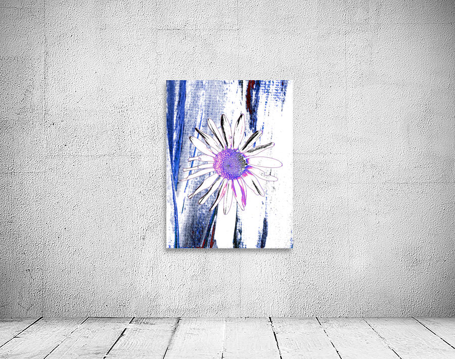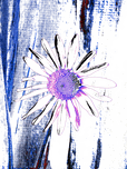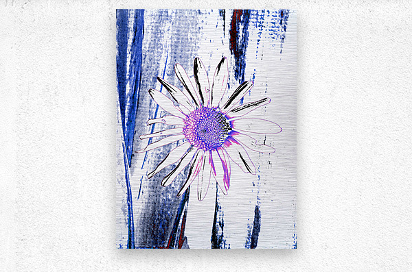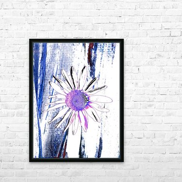 Originally a close up photo of a Daisy flower and a hand painted acrylic laterally digitally manipulated into a striking piece of floral art work. Features a vibrant Daisy with violet and black hues set against a streaked blue and white background. The petal details and central core stand out with a mix of delicate and bold lines.
