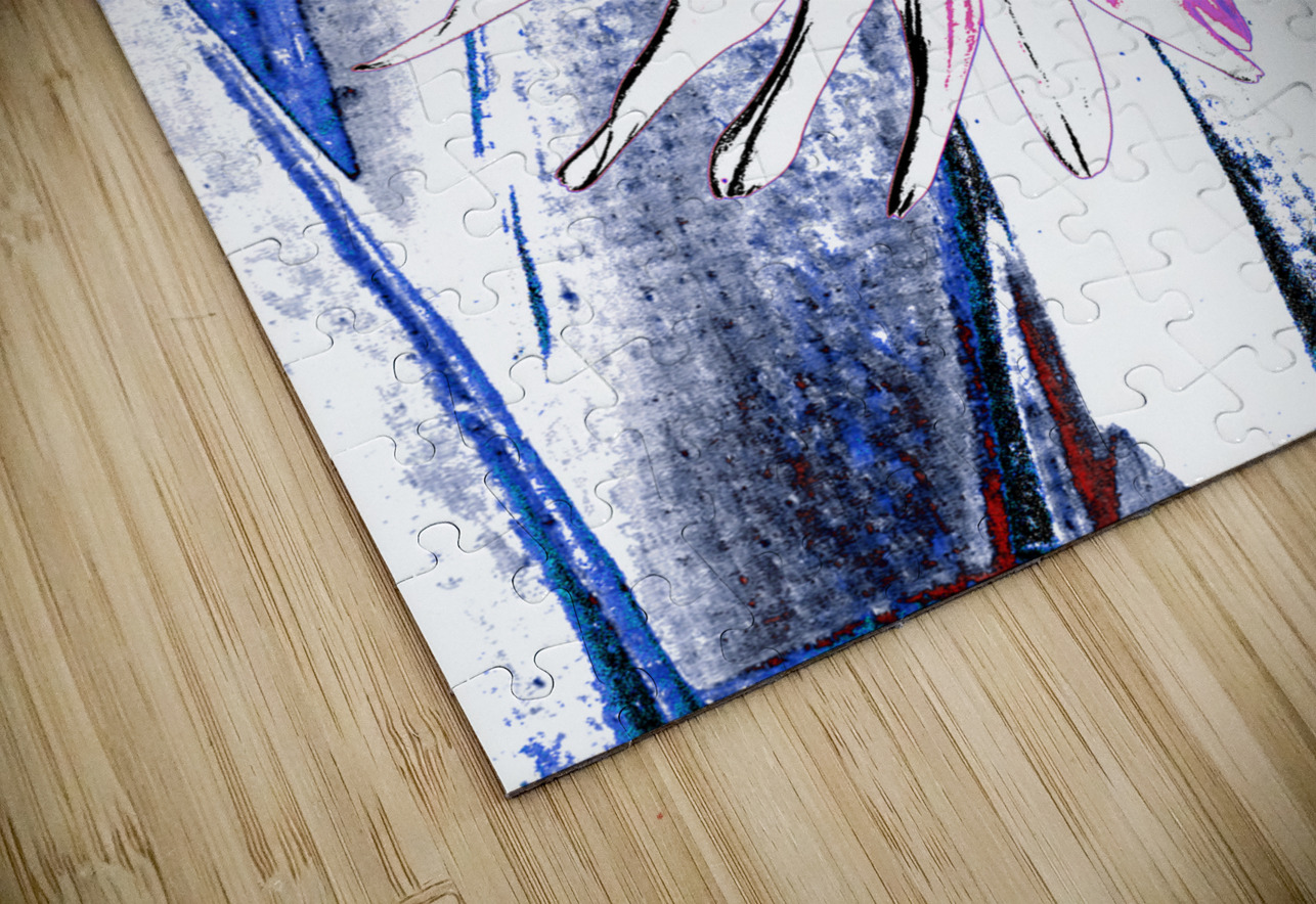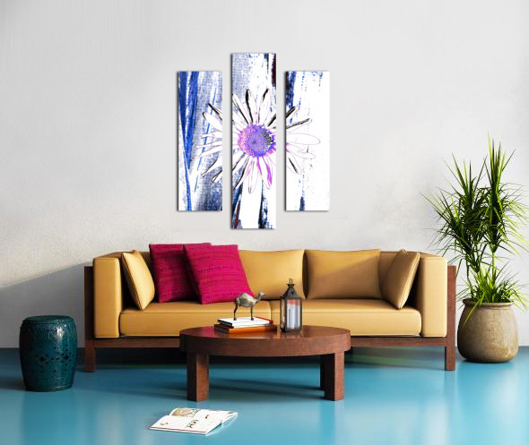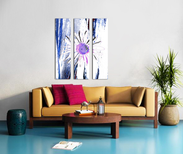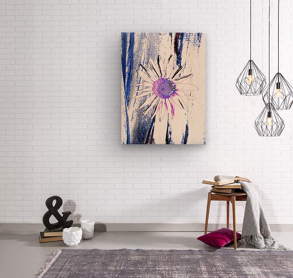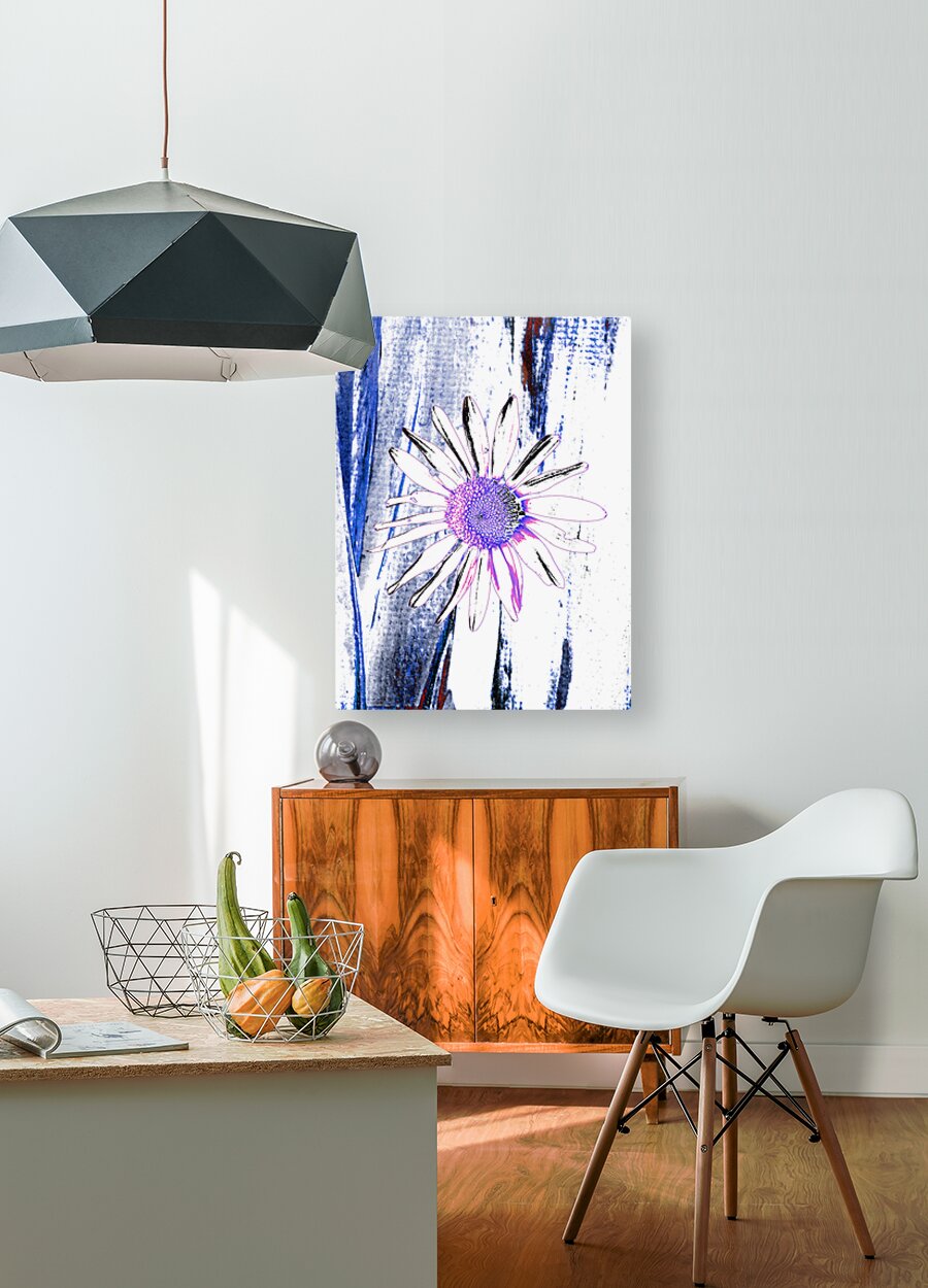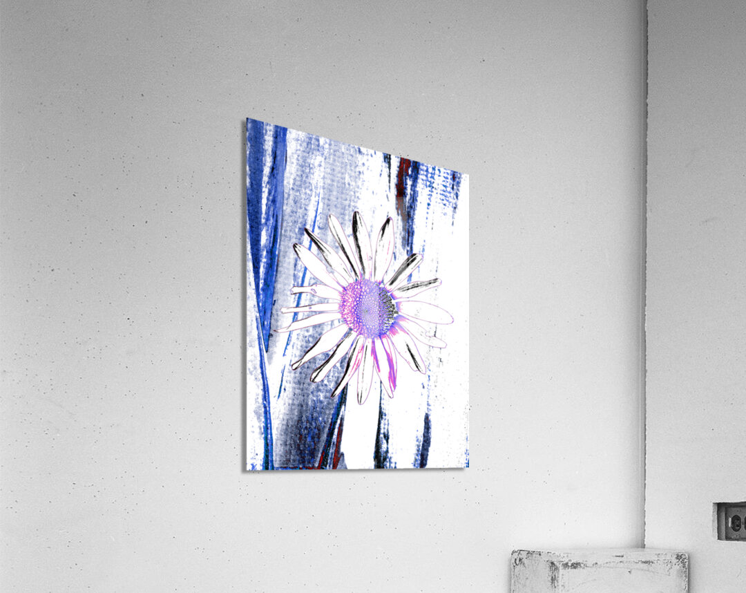 Originally a close up photo of a Daisy flower and a hand painted acrylic laterally digitally manipulated into a striking piece of floral art work. Features a vibrant Daisy with violet and black hues set against a streaked blue and white background. The petal details and central core stand out with a mix of delicate and bold lines.