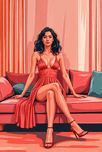 In a sunlit room adorned with soft peach and coral hues a woman exudes an air of confidence as she sits gracefully on a plush sofa. Her striking red dress flows elegantly around her the fabric hugging her form while cascading to reveal a tasteful glimpse of her legs elegantly crossed at the ankle. The dress with its deep neckline and intricate pleats whispers stories of sophistication and allure encapsulating both strength and femininity. Her dark wavy hair frames her face accentuating features that display poise and intensity. As she gazes forward her expression is a blend of mystery and self-assuredness inviting viewers to ponder the thoughts swirling in her mind. Behind her curtains billow slightly adding a dynamic element to the serene scene as if the very fabric of the universe is falling into place around her. The carefully chosen colors of the room—a palette of warm tones—create a harmonious backdrop that enhances her presence. Cushions in varying shades of green provide a contrast signifying comfort and relaxation. This sanctuary seems to hold secrets of conversations had laughter shared or perhaps a moment of solitude in contemplation. Every aspect of the image tells a story of empowerment where the woman represents more than beauty she embodies a sense of purpose and resilience. Perhaps she is waiting for a significant moment to unfold or she might be in reflection gathering strength for whatever lies ahead. The narrative is open allowing each observer to weave their interpretation into the fabric of the scene.