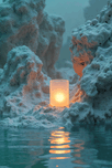 A solitary frosted glass lantern sits upon a rocky outcropping casting a warm orange glow across the tranquil water. The soft light illuminates the surrounding white almost-snowy rock formations creating a sense of peaceful solitude. The water a deep teal reflects the lanterns light in shimmering ripples adding to the serene and almost dreamlike atmosphere of the scene. The image evokes a sense of calm and introspection inviting the viewer to contemplate the beauty and stillness of the moment.