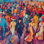 A bustling crowd in brightly colored attire moves through a public space, their energy captured in vibrant hues and dynamic brushstrokes. Technique: ...[+]