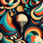 This vibrant image features an abstract artistic composition dominated by bold swirling patterns in teal orange yellow and black. At the center a vintage hot air balloon with an intricate design floats gracefully. The balloons smooth rounded shape contrasts with the sharp curved edges of the surrounding patterns creating a sense of movement and depth. The overall feel is both retro and modern invoking a sense of adventure dream-like exploration and fluidity. The bold color palette and dynamic shapes make it a visually striking almost surreal scene
