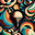This vibrant image features an abstract artistic composition dominated by bold swirling patterns in teal orange yellow and black. At the center a vint...[+]