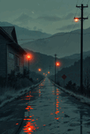 In the stillness of twilight a solitary road unfurls like a ribbon leading toward the horizon where the mountains loom shrouded in a veil of mist. The once vibrant colors of the day have faded into a muted palette casting the scene in deep greens and blues echoing the pervasive sense of solitude. On one side of the path stands a weathered house its wooden beams worn and tired as if bearing witness to countless stories of laughter and sorrow. The windows dimly lit whisper secrets of the past inviting a sense of nostalgia mingled with mystery. As the rain falls gently it paints the asphalt with shimmering reflections each puddle mirroring the eerie glow of streetlights. These amber orbs stand sentry along the way their soft luminescence warming the damp air yet they seem to pulse with an otherworldly energy guiding yet eerily beckoning. The landscape is quiet save for the hushed rustle of leaves and the soft murmur of rain. Theres a tension in the air—one can almost feel the lingering presence of stories unfinished. Perhaps this is a journey of introspection where one might reflect on choices made or not made. The path stretches forward a metaphor for life itself a reminder that every step taken leads into the unknown illuminated only by the flickering light of possibility. In this serene yet haunting tableau one might ponder the crossroads of existence where solitude coexists with the hope of new beginnings inviting all who wander to embrace both the beauty and uncertainty of the journey ahead.