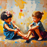 Oil painting depicting children playing, rich textures, visible brushstrokes, vibrant colors, light streaks, classic style, bright lens flare