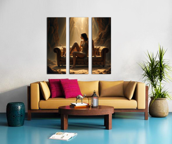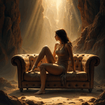 A woman sits on a brown leather couch in a surreal desert landscape. The couch is positioned between two towering rock formations with sunlight streaming through the narrow space between them. The womans pose is relaxed her gaze directed downward as if lost in thought. The scene evokes a sense of isolation and contemplation with the stark beauty of the desert setting amplifying the womans solitary presence. The warm light enhances the textures of the sand rock and leather creating a dramatic and ethereal atmosphere.