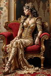 In a grand hall where the walls whisper secrets of a bygone era a figure occupies an opulent chair draped in rich crimson. She sits like a queen cloaked in elegance her golden attire gleaming as if spun from sunlight itself. The corseted bodice showcases her form with a regal flair intricately patterned with details that dance in the light. As she leans slightly her head adorned with a delicate crown there’s an air of confident poise. Her long dark hair cascades in luscious waves framing a face that holds a story untold. The lavish surroundings echo with the richness of the past where every golden detail on her gown reflects the artistry of a skilled hand. The patterns on the wallpaper reminiscent of nature’s embrace suggest a connection to a time when elegance was a language in itself. The ornate chair seems almost alive cradling her with a sense of history while the meticulous patterned floor beneath her adds depth to the tale unfolding in this moment. In this captured essence one might interpret her presence as a bridge between history and the future—a symbol of strength wrapped in beauty. Such imagery evokes thoughts of empowerment where tradition meets the modern reminding observers that every era carries its own stories waiting to be uncovered.