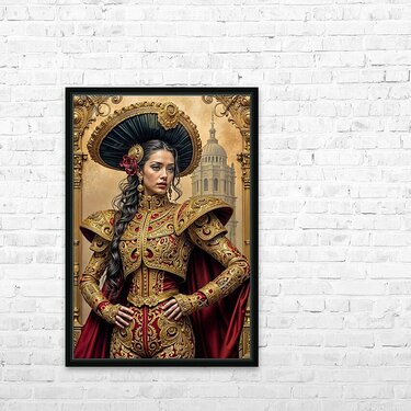 A woman with long dark hair wears a lavish gold and red outfit adorned with intricate embroidery and jewels. She gazes at the viewer with a hint of mystery and power her hands resting on her hips. Her headdress a black and gold hat with a large red flower adds to her regal presence. The background features a grand ornate building perhaps a palace or cathedral suggesting a setting of wealth and grandeur. The overall image evokes a sense of historical opulence and feminine strength.