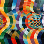 Checkerboard patterns flow and curve, creating a vibrant, three-dimensional illusion. Technique: Acrylic on canvas, influenced by Victor Vasarely and...[+]