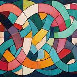 Interwoven ribbons of color create a dynamic, abstract composition. Technique: Acrylic on canvas, influenced by Frank Stella and Sonia Delaunay Artist's Intent: To evoke a sense of vibrant energy and visual harmony through the interplay of color and geometric form. Contribution: Strong appeal to collectors of abstract and geometric art, suitable for modern and contemporary interiors. Offers potential for limited edition prints and textile designs. Influences: Hard-edge painting technique with precise geometric shapes and bold color blocks, creating a sense of rhythmic movement and visual depth.