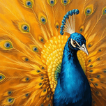 A majestic peacock in a classic oil painting style, showcasing warm golden hues and subtle color variations, detailed feathers and visible brushstroke...[+]