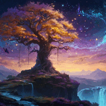 In this enchanting fantasy scene, a mystical island floats in a deep blue night sky, surrounded by glowing mist and dramatic waterfalls cascading into the void. A giant tree, radiating golden and blue lights, stands at the center of the island, its falling leaves transforming into glowing butterflies. In the background, towering snow-capped mountains rise, with a mythical dragon soaring across the horizon, leaving a trail of stars in its wake. The rich, dreamy colors—ranging from deep blue to purple and gold—create an atmosphere of magic and mystery, making this image an unforgettable fantasy masterpiece.