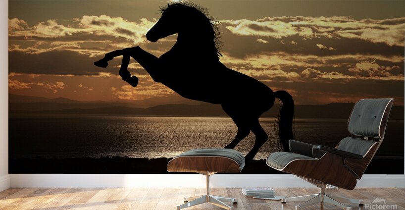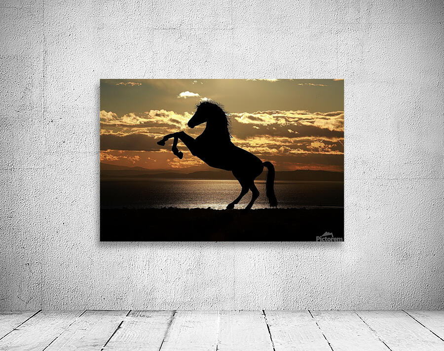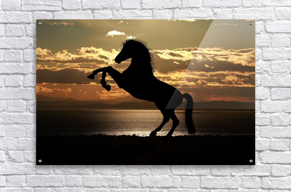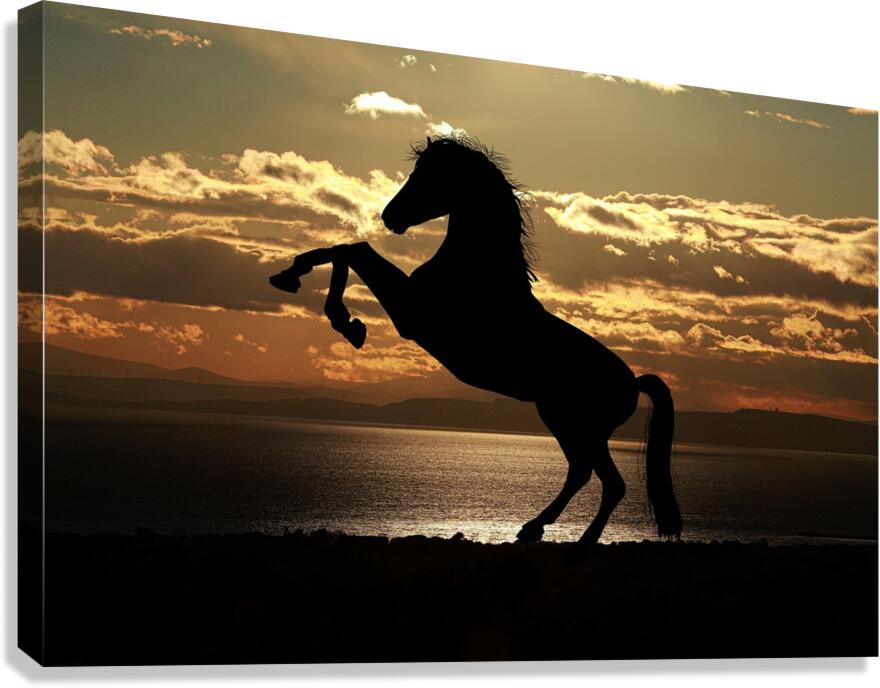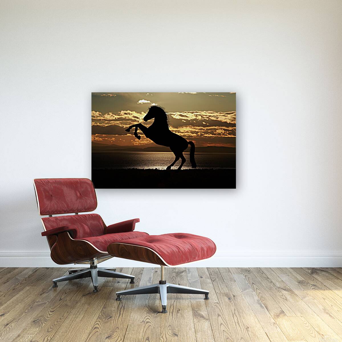 This breathtaking artwork showcases the silhouette of a rearing horse against a golden sunset, symbolizing power, freedom, and untamed beauty. The contrast between the dark form and the glowing sky creates a dramatic yet serene atmosphere, making it a striking addition to any home decor. Perfect for living rooms, offices, or bedrooms, this piece brings a sense of energy and inspiration to any space. Ideal for those who appreciate nature, equine art, and bold statement pieces.