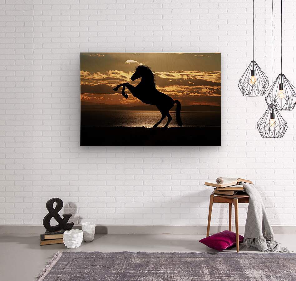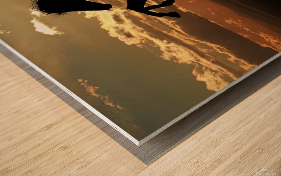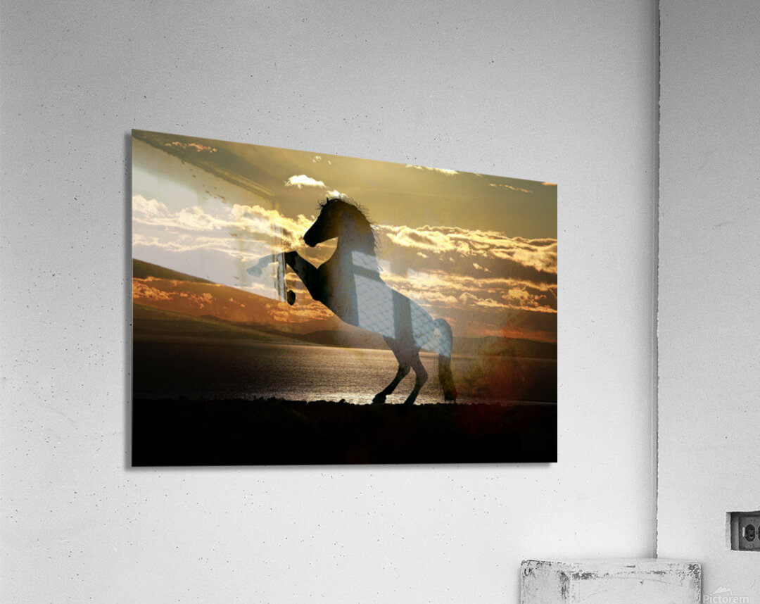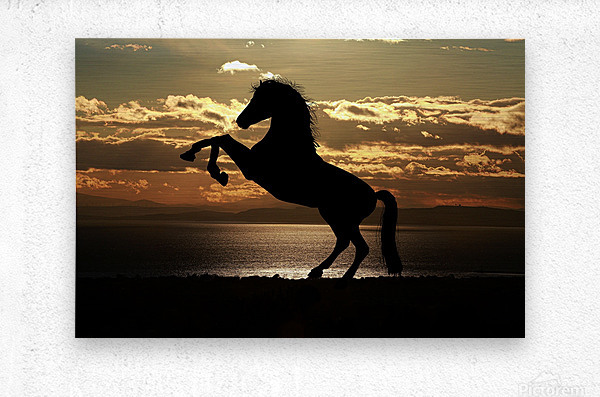 This breathtaking artwork showcases the silhouette of a rearing horse against a golden sunset, symbolizing power, freedom, and untamed beauty. The co...[+]
