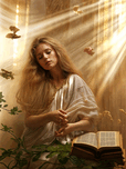 In a moment suspended between reality and dream a young woman draped in flowing ethereal fabric sits in a sun-kissed chamber. Soft beams of light filter through delicate curtains casting warm glows and illuminating her tranquil expression. Her long wavy hair cascades around her shoulders adorned with whispers of sunlight that dance like fairies above her. Nestled beside her is an open book its pages gently rustling as if stirred by an unseen breeze. The volumes of words invite the curious to delve into their depths promising stories untold and secrets waiting to be unveiled. Around her gentle butterflies float—tiny messengers of transformation adding a touch of whimsy to the serene atmosphere. The lush greenery encircling her hints at life and vitality grounding this surreal tableau in nature’s embrace. Each leaf and vine seems to contribute to this magical sanctuary where the boundaries between the ordinary and extraordinary blur. As she ponders perhaps she draws wisdom from the pages beside her striving to understand her own path in the tapestry of existence. This scene captures the delicate dance of introspection and inspiration suggesting that in quiet moments of reflection one can find a connection to the stories of the past and a beacon for the future. Here magic resides not just in the ethereal light or the fluttering wings but in the stillness of thought and the promise of what lies ahead.