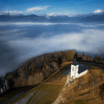 Jamnik Church also known as the Church of Saints Primus and Felician in Jamnik Slovenia rises above fog in the valley below in the Ljubljana Basin. The Kamnik-Savina Alps rise in the distance.