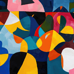 Interlocking shapes and vibrant colors create a sense of playful energy and movement. Technique: Acrylic on canvas, influenced by Sonia Delaunay and ...[+]