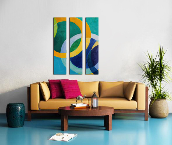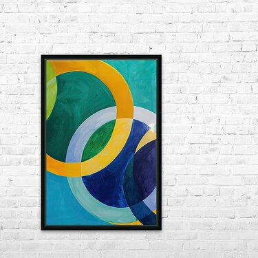 Interlocking circles in vibrant hues, exploring color relationships and geometric harmony. Technique: Acrylic on canvas, influenced by Sonia Delaunay and Robert Delaunay Artist's Intent: To evoke a sense of visual harmony and dynamism through the interplay of color and form. Contribution: Appeals to collectors of abstract art with a focus on color field and geometric abstraction. Suitable for modern and contemporary interiors. Influences: Dynamic interplay of overlapping circular forms, creating rhythmic movement and chromatic vibrations.