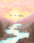 ABOUT THIS ARTWORK: NATURE MOUNTAIN BIRDS RIVER SUNSET
